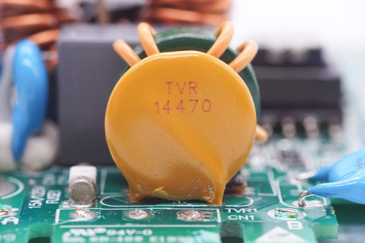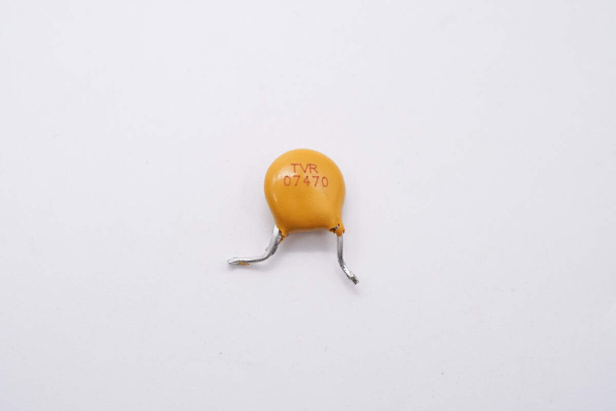 黄色压敏电阻丝印TVR07470,用于过压浪涌保护。
