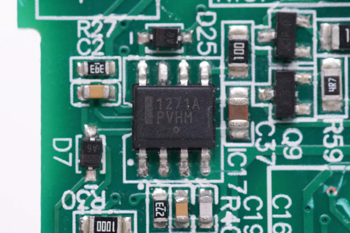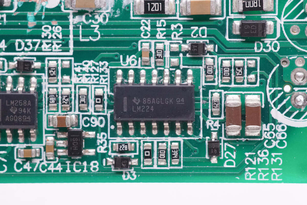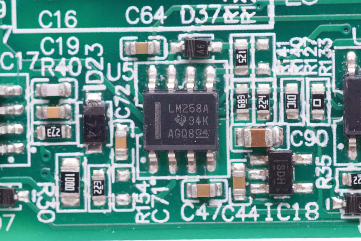 PCBA模块一侧焊接NCP1271升压控制器,德州仪器的工业级LM258A双运放和LM224四运放。