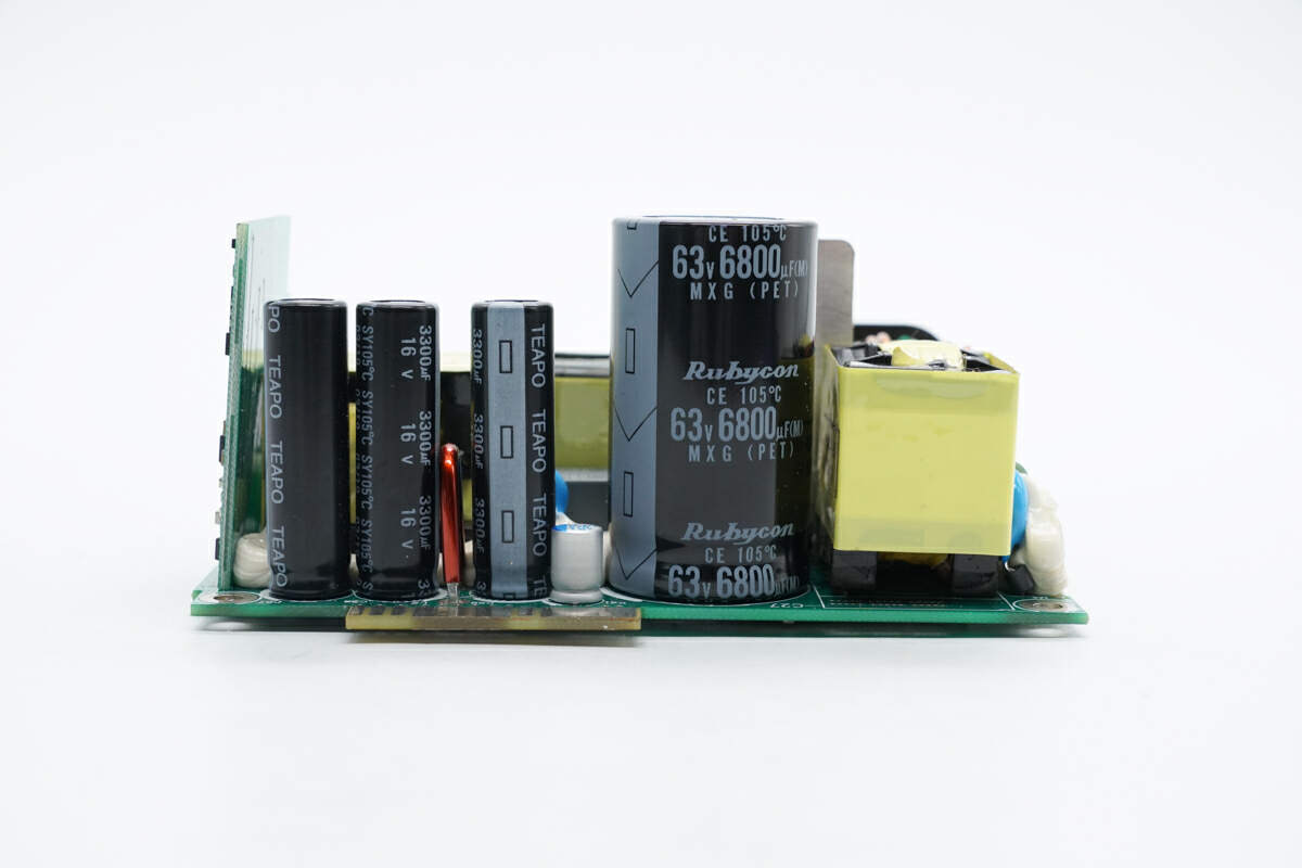 输出滤波电容来自红宝石,MXG系列 3000小时寿命,规格为63V6800μF。