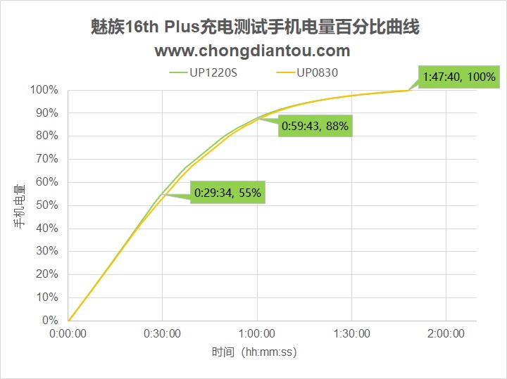 两款充电器对魅族16th Plus均能实现快充,其中UP1220S充电器大功率充电器时间可持续36分钟左右,UP0830充电器的大功率充电时间可持续30分钟左右,后续的功率曲线变化趋势基本一致。