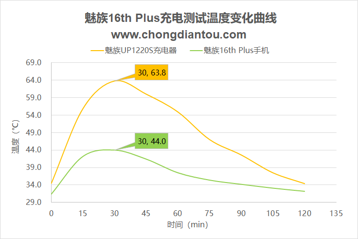 在室温29℃的环境中,原装UP1220S充电器对魅族16th Plus的充电温度变化曲线如上图,手机和充电器的表面最高温度均出现在充电30分钟左右,手机端最高温约为44℃,温升12.6℃;充电器最高温度约为63.8℃,温升约29.4℃(均基于FLIR热成像测温仪测试结果)。