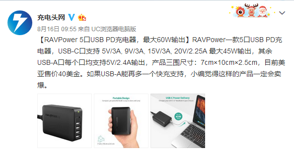 近期,具知名数码博主充电头网爆料,RAVPower推出了新款多口充电器——RAVPower 5口USB PD充电器,型号RP-PC059。