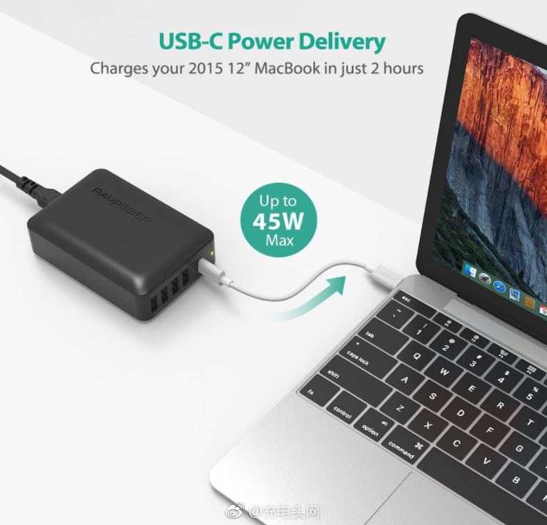 USB Type-C支持5V/3A, 9V/3A, 15V/3A, 20V/2.25A四档输出,最大45W PD输出,2个小时左右即可充满12英寸的Mac Book(2015年款)。其余USB-A口每个口均支持5V/2.4A输出,给iPhone、iPad充电也能达到一个不错的充电效果。