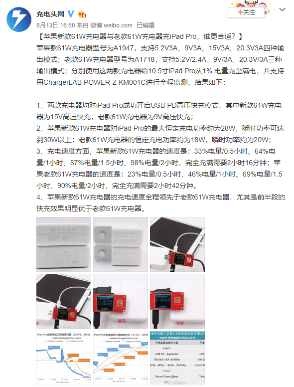 那么实际充电效果如何呢?充电头网分别使用这两款充电器给10.5寸iPad Pro从1% 电量充至满电,并支持用ChargerLAB POWER-Z KM001C进行全程监测,结果如下: