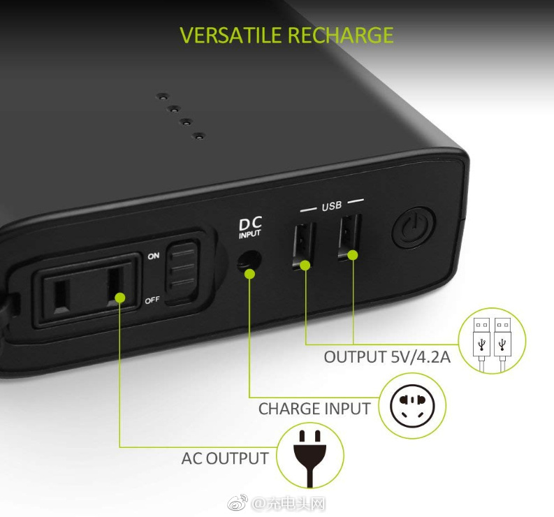 除此之外,还具有4颗电量显示灯以及交流电输出开关,切换输出模式非常方便。最主要的是这款储能电源可以带上飞机,出差或旅游携带都可以。