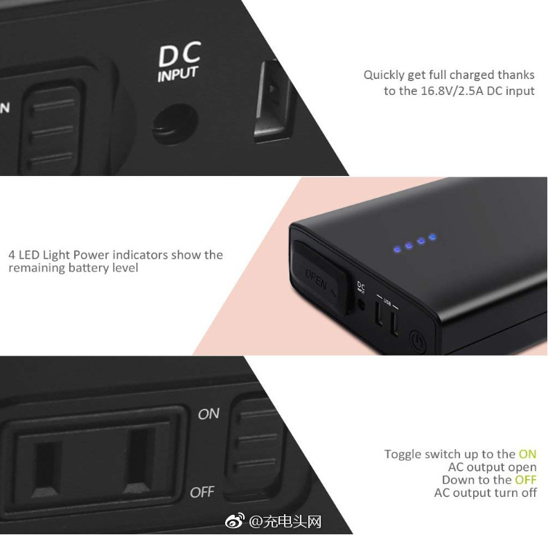 两个USB口分别支持5V/2.1A输出,可充手机等数码设备;移动电源自身充电采用DC圆口,支持16.8V / 2.0A输入;AC插孔则可以交流输出,最高功率88W,能充笔记本等给一些功率在88W内的设备供电。