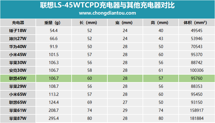 从测试来看,联想LS-45WTCPD充电器优缺点如下: