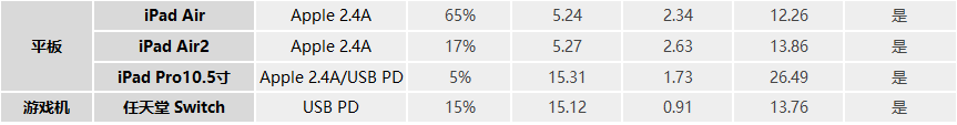三款平板和任天堂Switch游戏机都能进行充电,其中iPad Pro和任天堂Switch游戏机都顺利握手了USB PD快充。