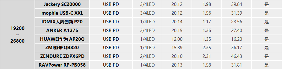 在充19200~26800mAh移动电源时,同样是可以给支持USB PD协议的移动电源快充,尤其是Jackery、mophle、IDMIX、ANKER、ZENDURE、RAVpower这几款移动电源,都是20V的高压充电,ZENDURE更是达到了46W,充电速度很快。