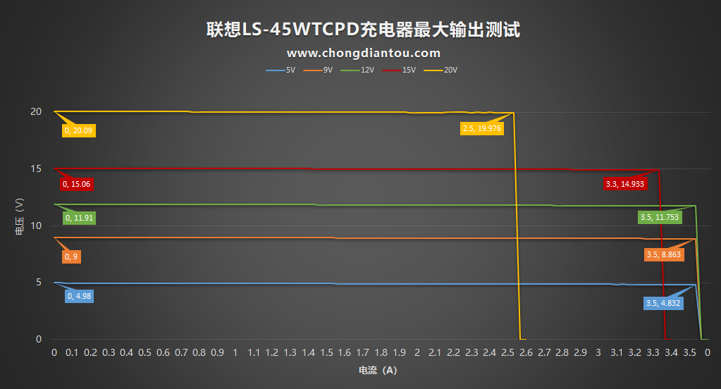 首先是最大输出测试。5V、9V、12V最大输出电流都为3.5A,15V档位的最大输出电流为3.3A,20V档位的最大输出电流为2.5A。