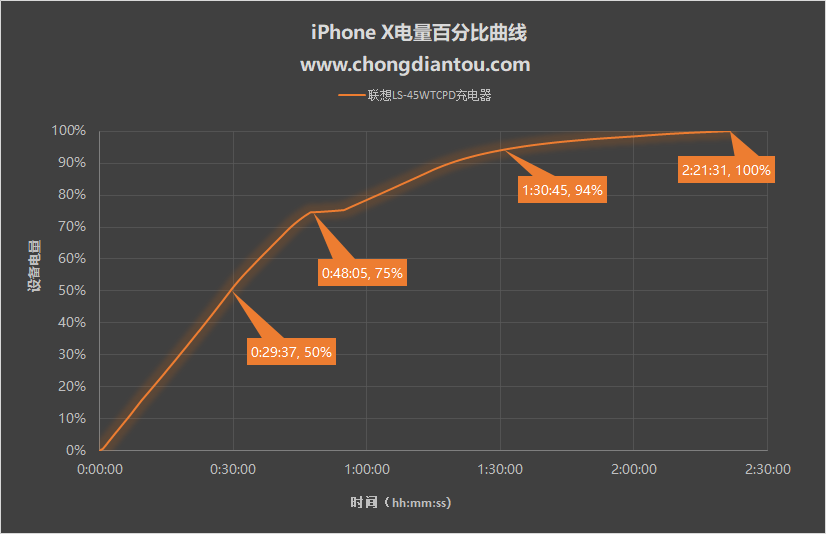 兼容性、最大输出、温度控制、效率转化测试做完了,但是在实际的使用当中表现会如何呢?为此,小编分别用联想LS-45WTCPD充电器对MacBook Pro 13寸 2018款和iPhone X进行了0-100%充电测试。