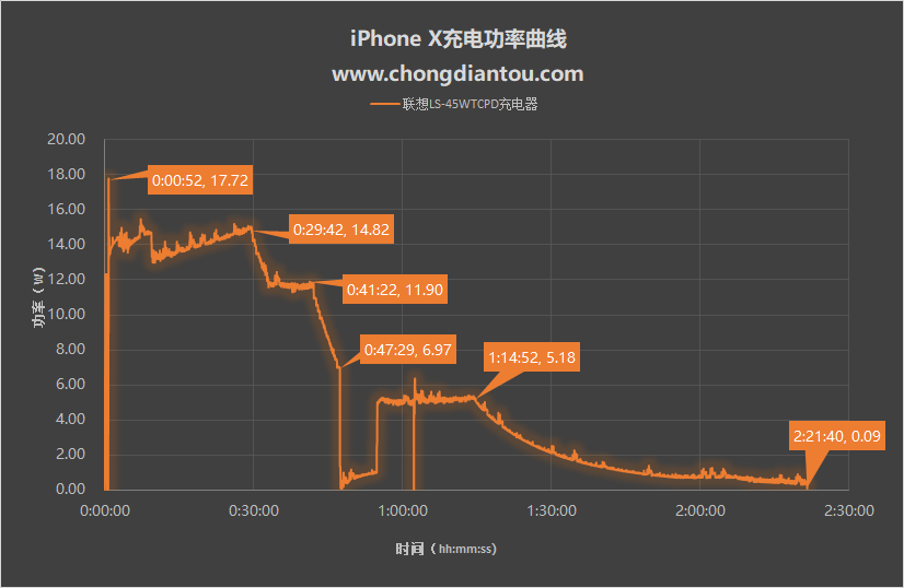 功率变化方面。一开始,功率上升到18W左右,但是时间不长,随后开始下降。半小时前这一段,功率基本在13W-15W徘徊。在48分钟左右时,电量达到75%,功率会直线下降跌落,一段时间低功率后开始逐渐回升。在1小时14分钟,功率曲线呈现滑梯式下降,在2小时21分钟时,跌落为0,电量充满。