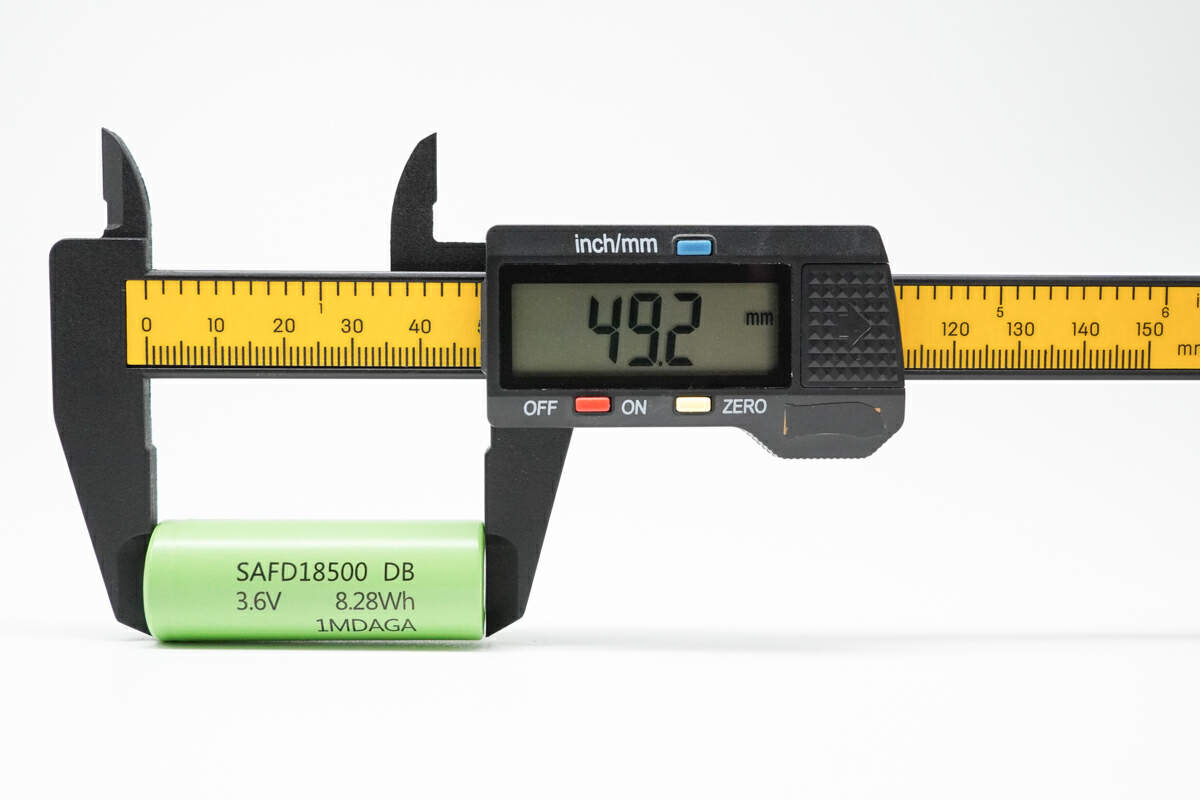 使用塑胶卡尺测得,赛富德SAFD18500DB电芯圆柱高度约为49.2mm。