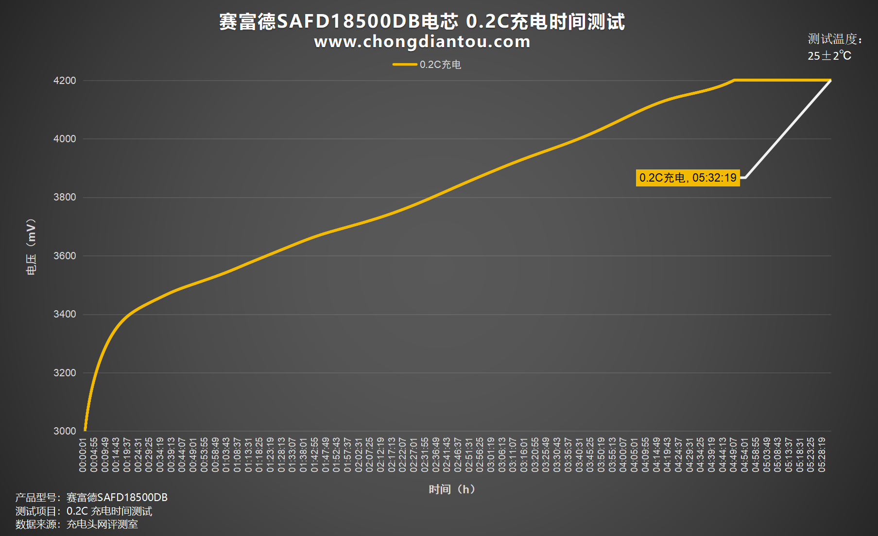 绘制出折线图,设置电流为 460mA,0.2C为赛富德SAFD18500DB电芯充电,充电截止电压为 4.2V,耗时5小时32分。