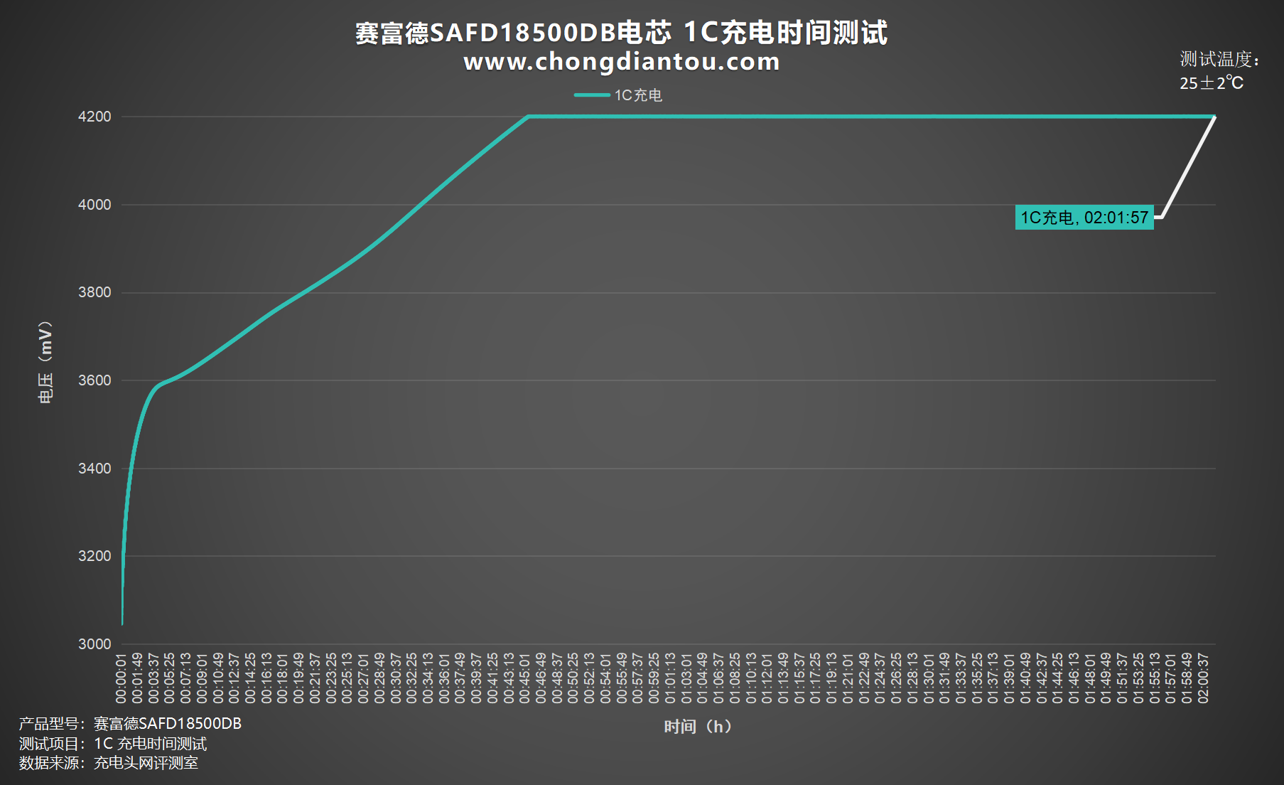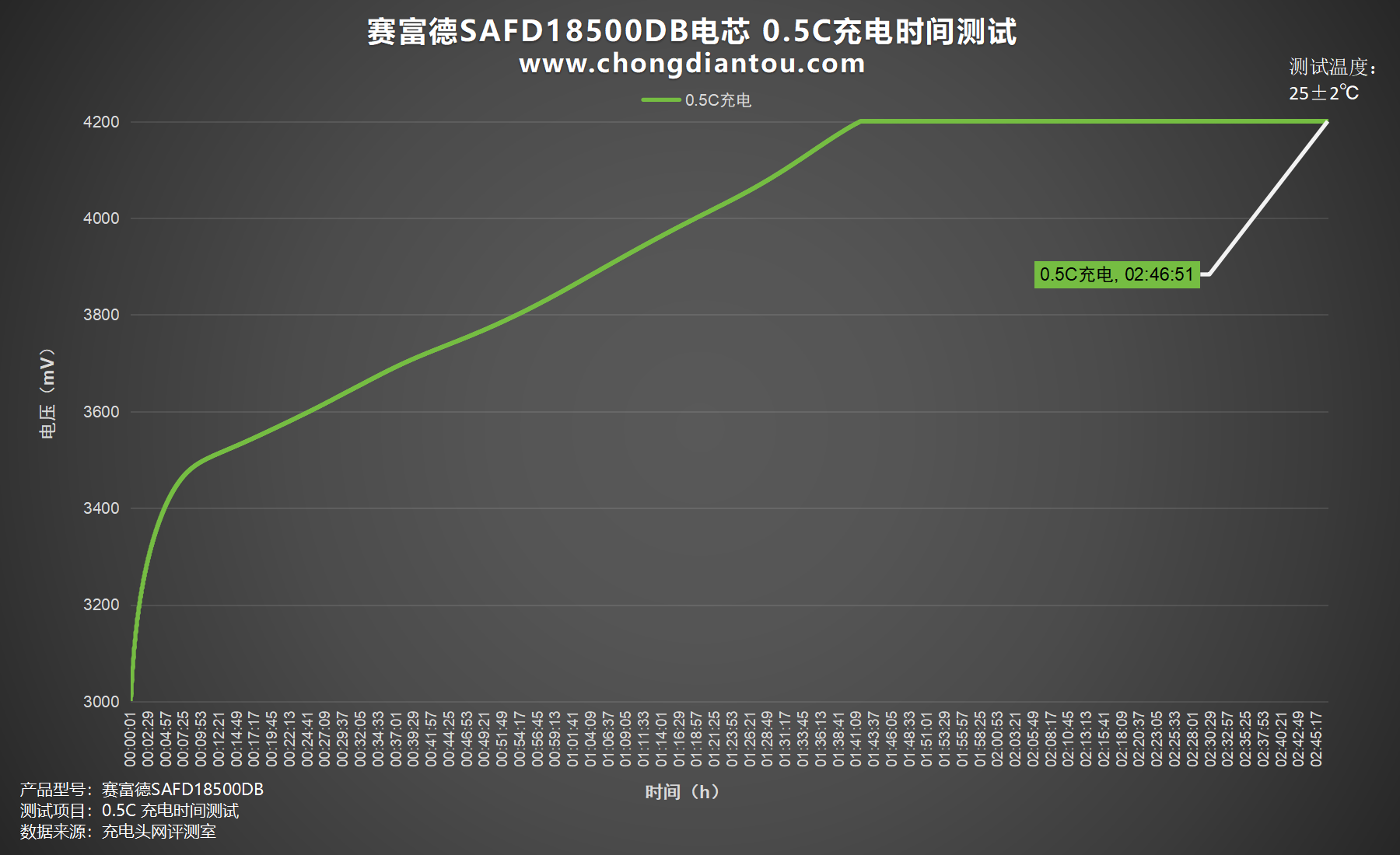 绘制出折线图,设置电流为 2300mA,1C为赛富德SAFD18500DB电芯充电,充电截止电压为 4.2V,耗时2小时01分。