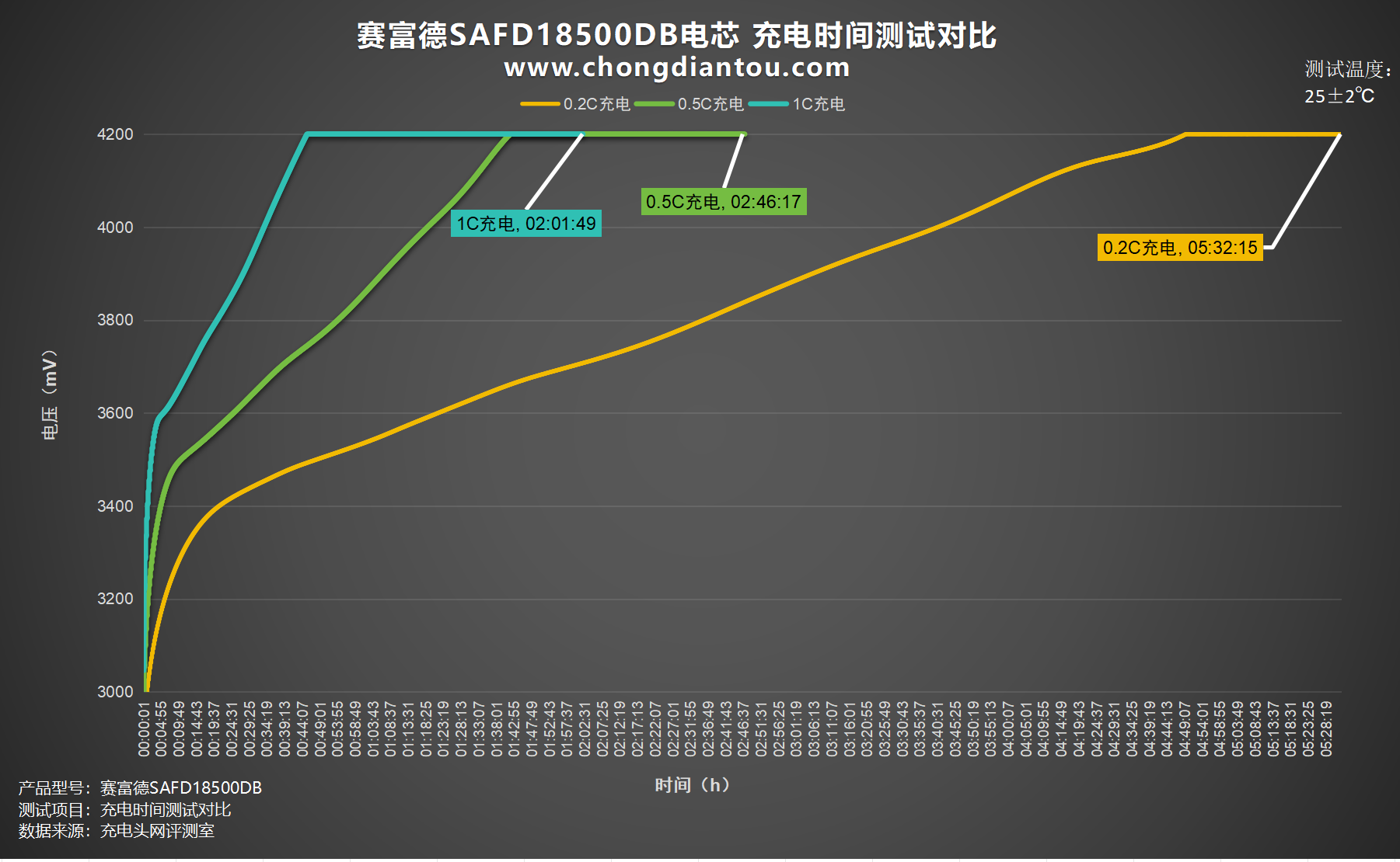 将测试数据绘制成折线图,充电测试中0.2C充电充满耗时5小时32分钟,0.5C充电充满耗时2小时48分钟,1C充电充满耗时2小时01分钟。