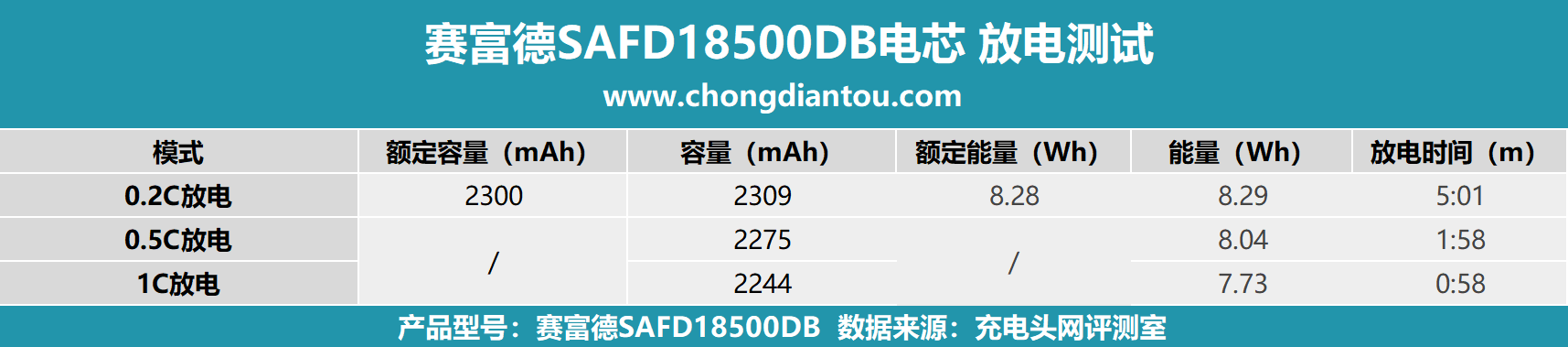 这款赛富德SAFD18500 DB电芯,充电头网分别在0.2C、0.5C以及1C三种倍率下测试,充电方面,1C倍率充电能在2小时01分完成充电,放电部分,可以看到0.2C倍率放电放出容量2309mAh,超过标称容量,同样放出能量也是最高的,达到8.29Wh。