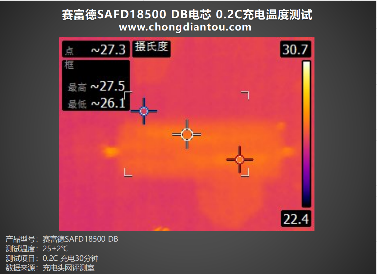 将赛富德SAFD18500 DB电芯以0.2C倍率进行充电30分钟,表面最高温度为27.5℃左右。