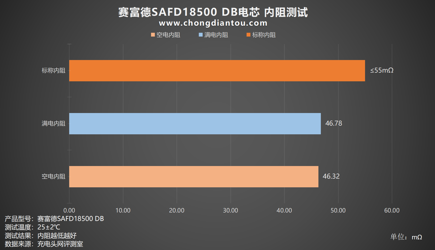 测试数据汇总至表格,可以看到满电内阻电压为 4.2V,空电内阻电压则为 2.5V,赛富德SAFD18500 DB电芯标称内阻是 ≤55mΩ。