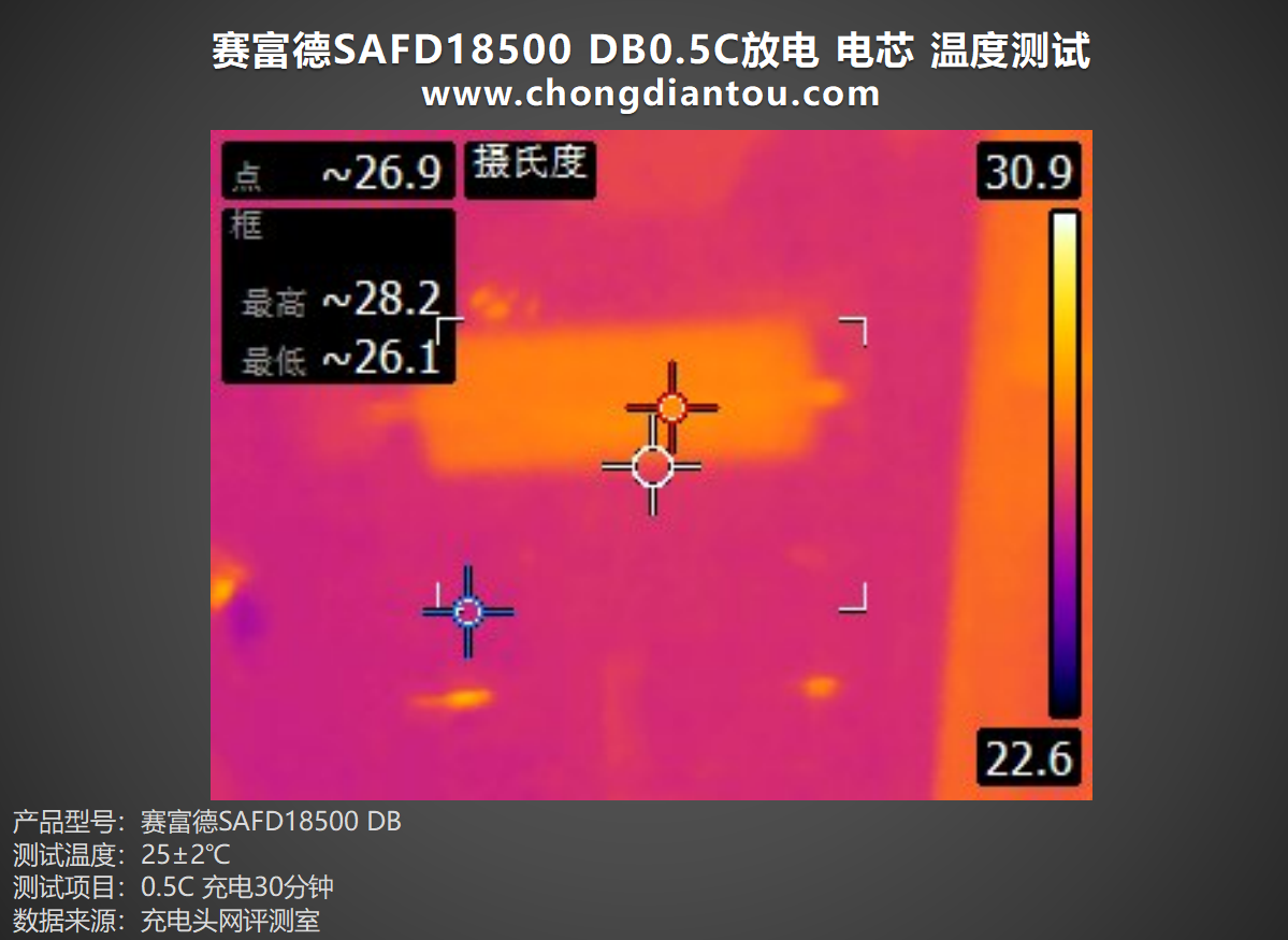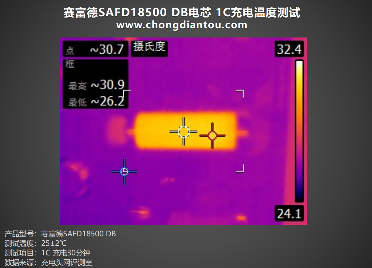 将赛富德SAFD18500 DB电芯以1C倍率进行充电30分钟,表面最高温度为30.9℃左右。