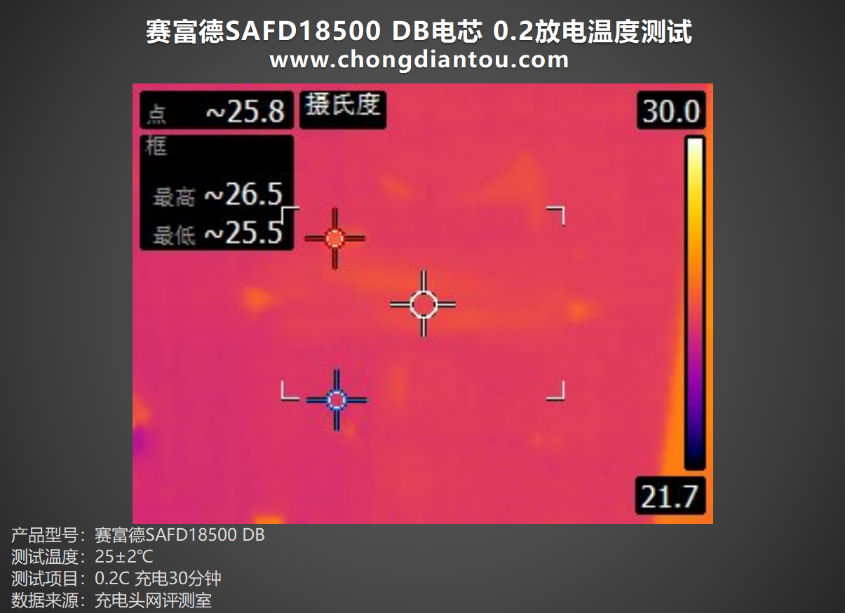 将赛富德SAFD18500 DB电芯以0.2C倍率进行放电30分钟,表面最高温度为26.5℃左右。
