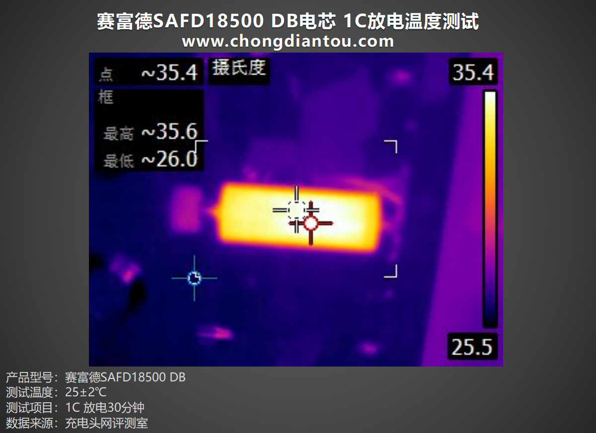 将赛富德SAFD18500 DB电芯以1C倍率进行放电30分钟,表面最高温度为25.6℃左右。
