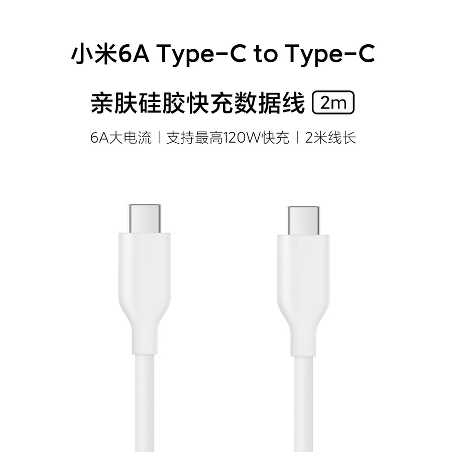 小米 6A USB-C to USB-C 硅胶快充数据线相比小米手机配送数据线拥有三大优势,第一个优势是:超长,2m 的长度让用户可以随意地使用,床上、沙发、办公桌,足够长的数据线让充电怎么舒服怎么来。第二个优势是:柔韧,硅胶材质的加入改善了原配数据线粗硬的不适感,不缠绕易收纳。第三个优势是:更通用,CtoC 是 USB PD 快速充电标准最通用的数据线形态,第三方配件可用,小米私有快充的 USB-C 充电器也可用,最高支持 120W 小米私有快充,还能为笔记本等数码产品充电、传输数据。