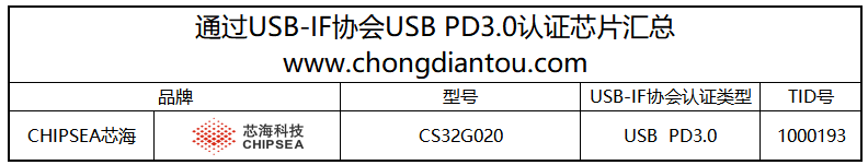 芯海科技研发的CS32G020是一颗双向USB PD协议芯片,目前已经通过了协会的USB PD3.0认证(TID号为1000193)。
