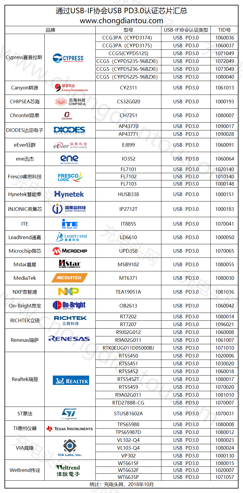 据充电头网不完全统计,目前有24家芯片原厂的方案已经取得了USB IF协会的PD3.0认证,芯片型号多达46款。而采用这些方案生产的USB PD充电配件,均可对IPhone XS Max实现良好的兼容,产品的性能也能得到足够的保障。这些芯片及厂家的具体信息如下: