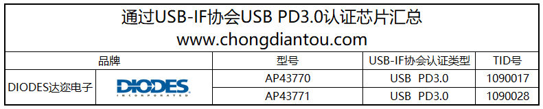 目前DIODES旗下的AP43770(TID号为1090017)和AP43770(TID号为1090028)两款芯片已经通过可USB-IF协会的PD3.0认证。
