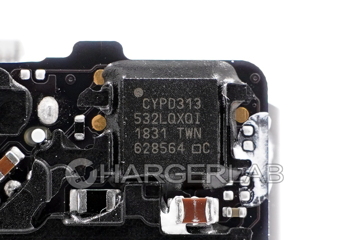 另一颗快充协议芯片负责USB PD的握手通讯,来自赛普拉斯公司,型号为CYPD313,这也是一颗专为苹果定制的型号,内部还烧录了苹果充电器SN编码。