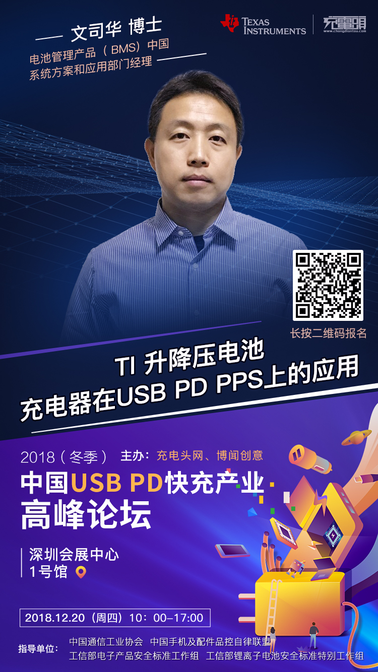 德州仪器(TI)电池管理产品( BMS)中国系统方案和应用部门经理 文司华博士,本次高峰论坛的演讲主题是《TI升降压电池充电器在USB PD PPS上的应用》。文司华先生是美国弗吉尼亚理工大学工程硕士和博士,有超过12年的在TI电池管理产品的研发经验。致力于提升公司在电池管理、快速充电、可穿戴智能硬件以及绿色能源领域业务的增长。早期作为应用和系统开发工程师,他曾在TI从事BMS产品的研发工作。曾在各类国际研讨会、期刊和杂志发表文章30余篇,并获得过一项美国专利。