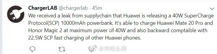 来自ChargerLAB爆料消息显示,华为正在开发一款支持40W SuperCharge超级快充移动电源,充电电压、电流分别为10V 4A,容量为10000mAh,有望成为这一容量段充电速度最快的量产产品。