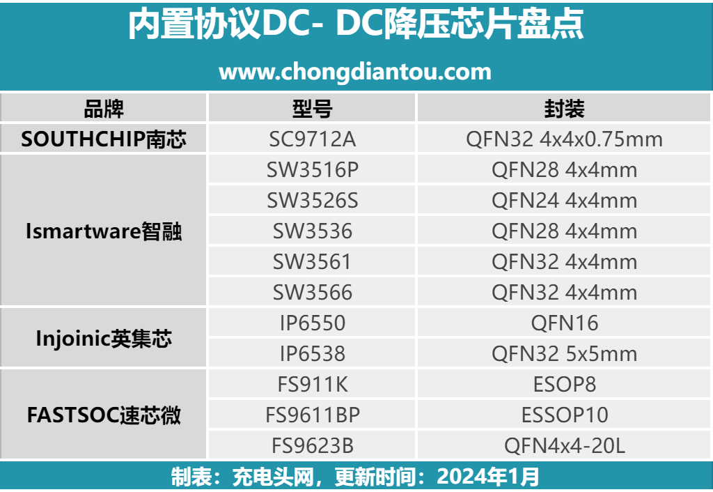充电头网精心统计了参与2024(春季)亚洲充电展的众多快充芯片企业所推出的多款集成充电协议的降压控制芯片,并将这些信息汇总整理形成了下表,详细展示了各家企业的主打产品及其相关封装特点。