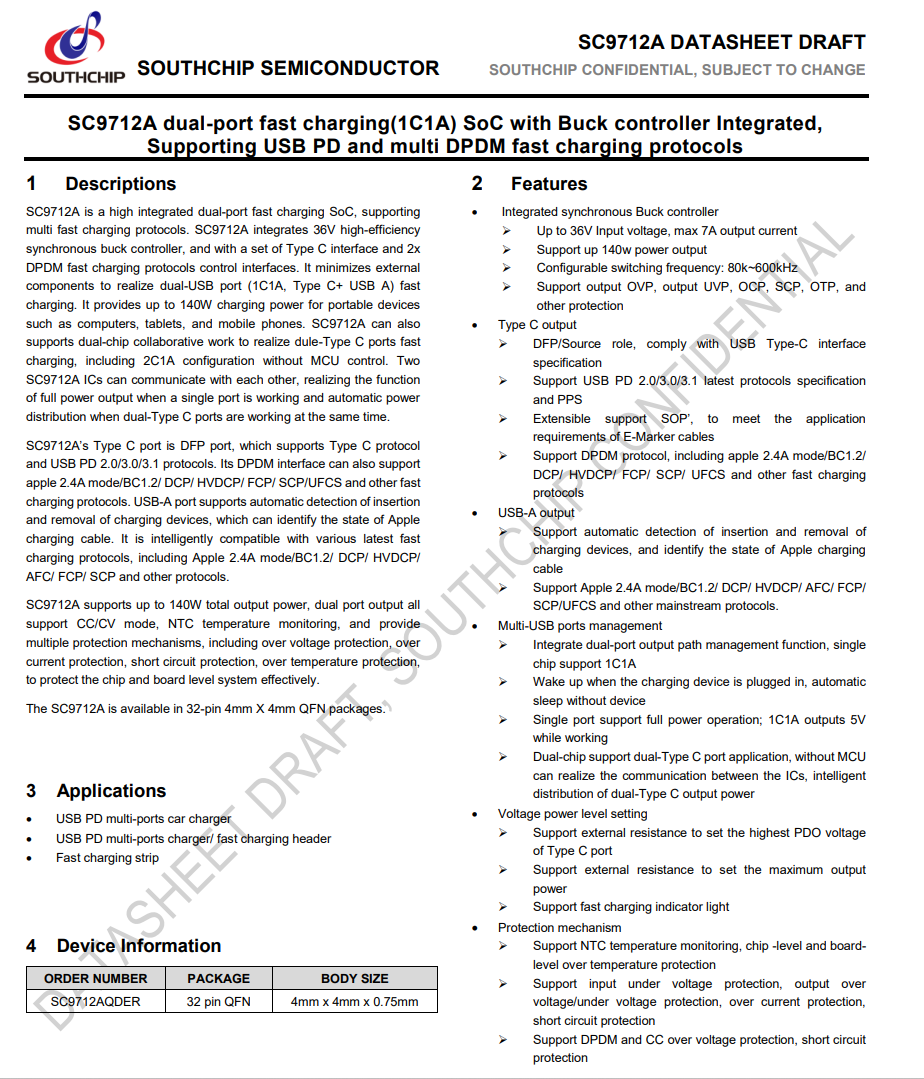 SC9712A是一款高度集成的双端口快充SoC芯片,支持多种快充协议。SC9712A整合了36V高效同步降压控制器,具有最大7A输出电流,并具有可配置80k~600kHz的开关频率,还配备了一组Type C接口和2个DPDM快充协议控制接口,可以最大程度地减少了外部元件,实现了双USB端口(1C1A,Type C+ USB A)的快速充电功能,为便携设备,如电脑、平板电脑和手机等提供高达140W的充电功率。