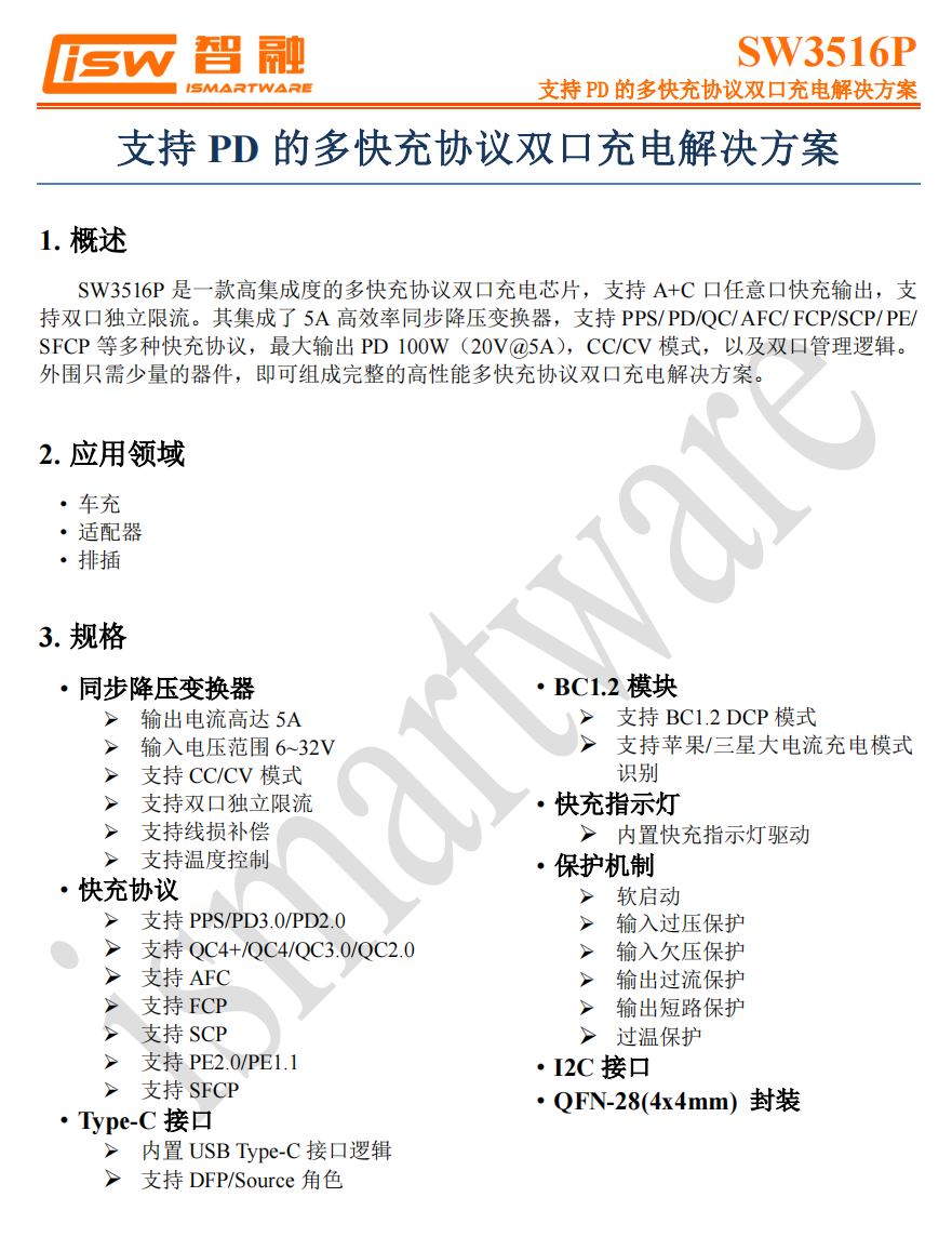 智融SW3516P是一款高集成度的多快充协议双口充电芯片,支持最大100W功率输出,支持A+C口任意口快充输出,支持双口独立限流。
