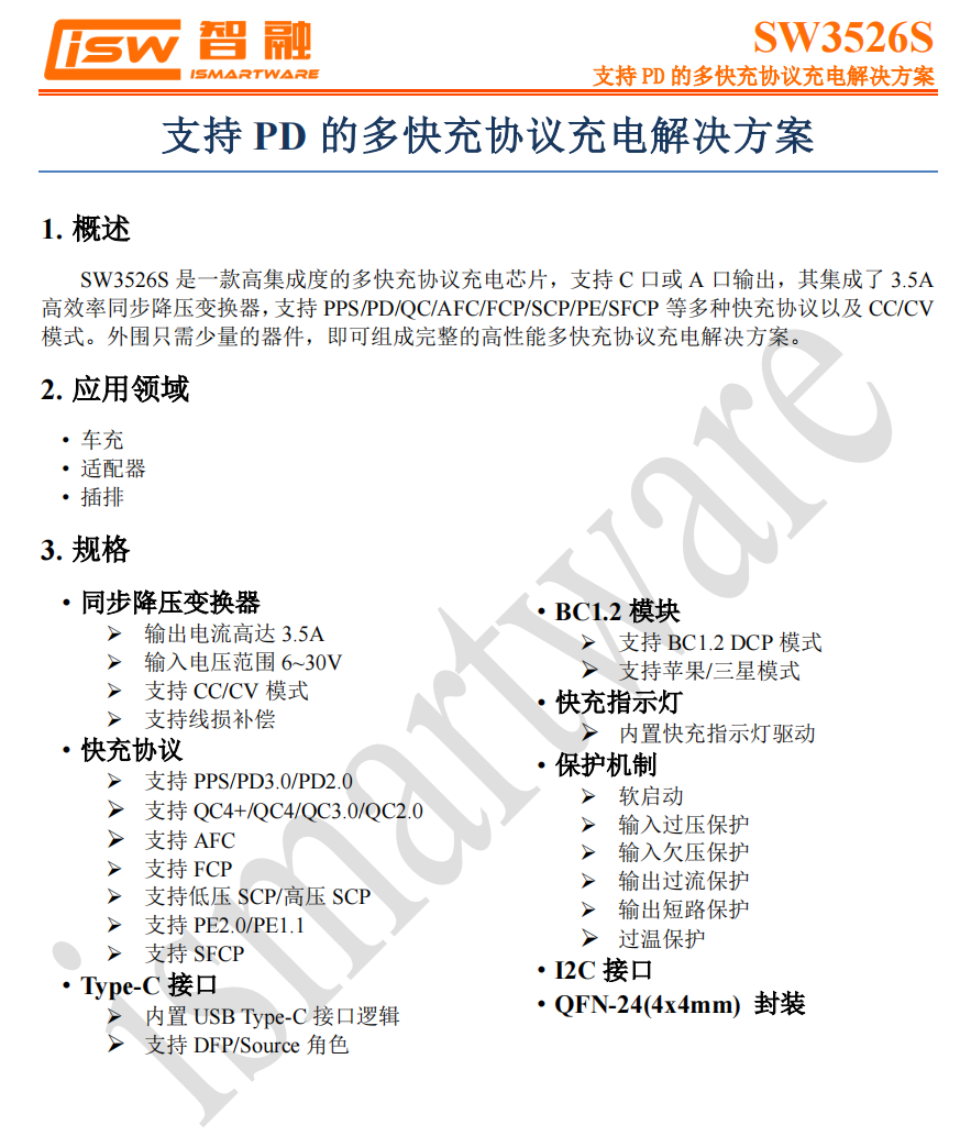 智融SW3526S芯片可支持USB-C口或者USB-A口输出控制,内部集成了3.5A高效率同步降压转换器,支持PPS、PD、QC、AFC、FCP、SCP、PE、SFCP等充电协议,支持CC/CV模式,外部仅需少量器件,即可组成完整的高性能多快充协议充电解决方案。