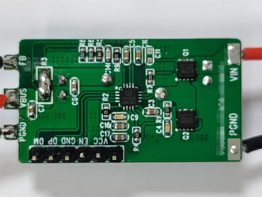 图片为英集芯IP6550的参考设计,IP6550是一颗高效率同步降压转换器,内置NMOS驱动器,驱动两颗外置MOS管用于同步降压。电路板背面为滤波电容和降压电感。支持外部反馈调节输出电压,I²C总线调节输出电压和输出恒流。