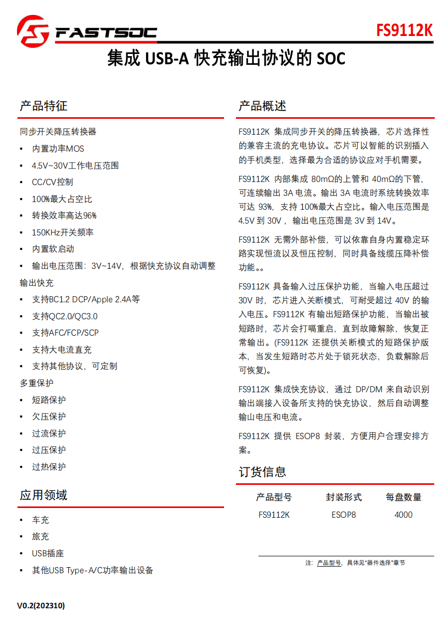 FS911K是一款集成USB-A快充输出协议的SOC芯片,集成同步降压转换器,还能选择性地兼容多种主流充电协议。这款芯片能够智能识别连接的手机类型,从而挑选出最适合的充电协议,以满足手机的充电需求。