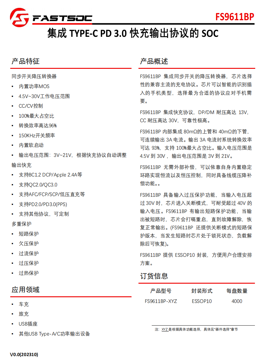 此外,FS9611BP 无需外部补偿,依靠其内部构建的稳定环路,能够实现恒流和恒压控制。同时,它还具备线缆压降补偿功能,提供 ESSOP10 封装。
