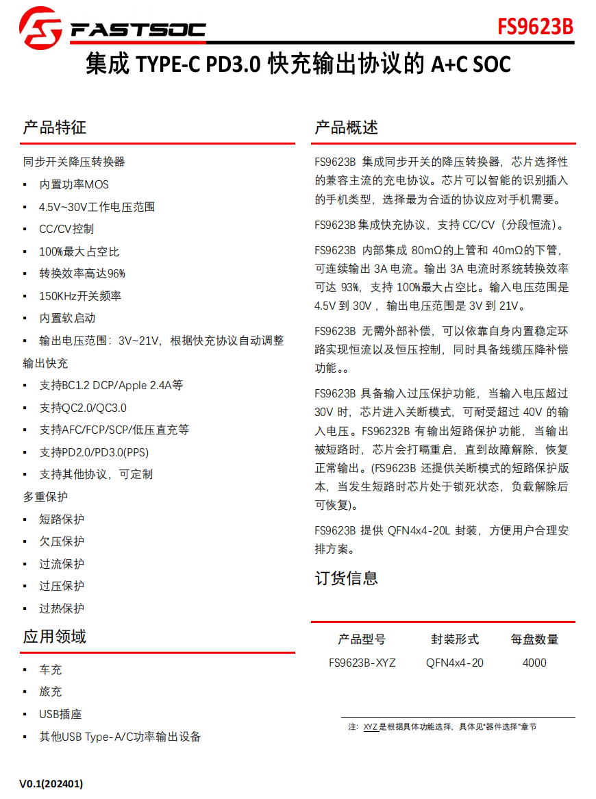 FS9623B是一款支持A+C双口的降压转换器芯片,支持PD3.0、BC1.2、QC3.0/2.0、Apple 2.4A、AFC、SFCP、PPS等快充协议,还可以根据需要自定义协议,这款芯片能够智能识别连接的手机类型,从而挑选出最适合的充电协议,以满足手机的充电需求。