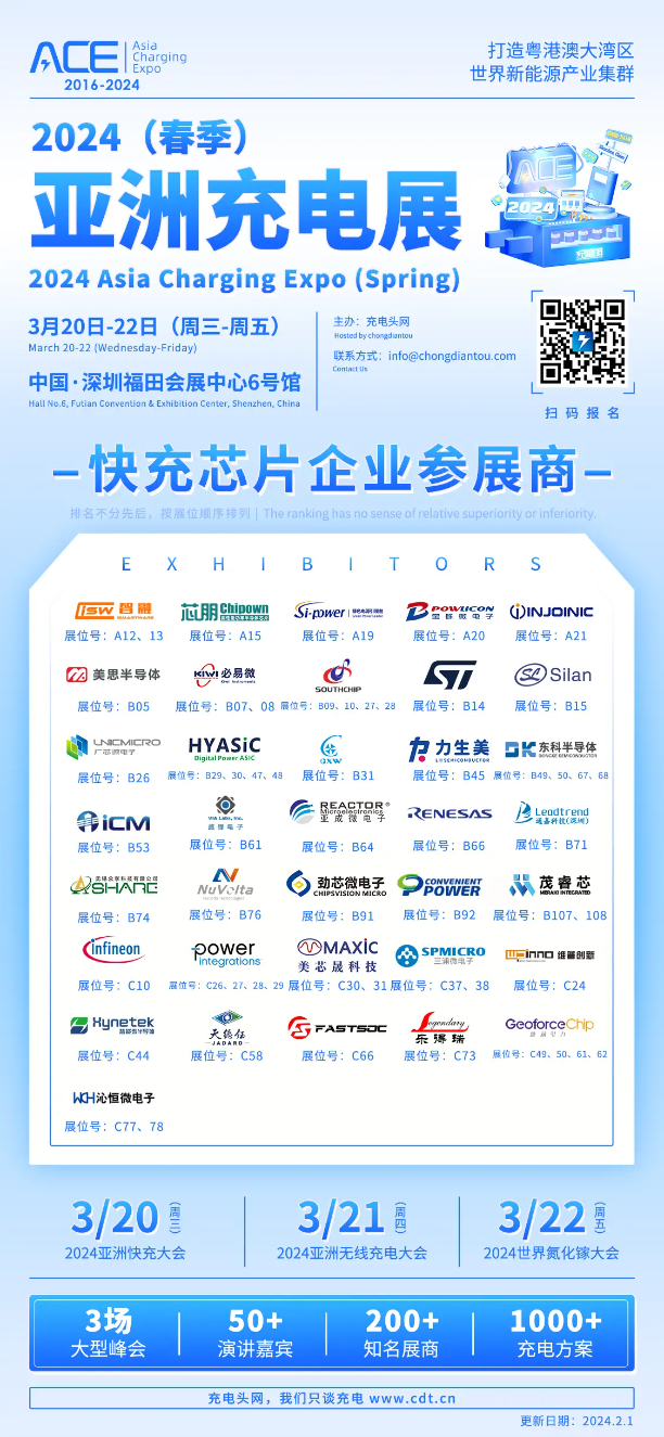 2024(春季)亚洲充电展,3月20-22日将在深圳举办,届时将有多家快充芯片企业参展,并发布多款新品和参考设计。