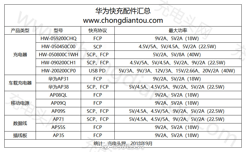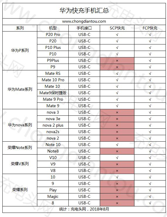 同时,充电头网也了解到,截止2018年8月,华为支持SCP快充且接口为USB-C的手机共计13款,其中华为手机有10款,荣耀手机有3款;支持华为FCP且接口为USB-C的手机共有27款,其中华为手机有17款,荣耀手机有10款。 华为手机快充生态链已经具备一定规模。