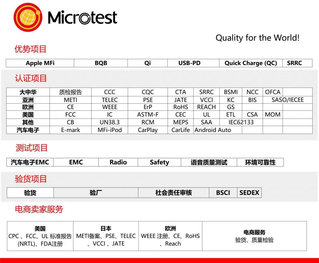 一站式:Microtest已建立起十余个专业实验室,企业通过微测检测就可以获得一站式的测试与认证解决方案;(EMC、RF、MFi、BQB、QI、USB、安全、锂电池、快充、汽车电子EMC、汽车手机互联、语音通话质量)。