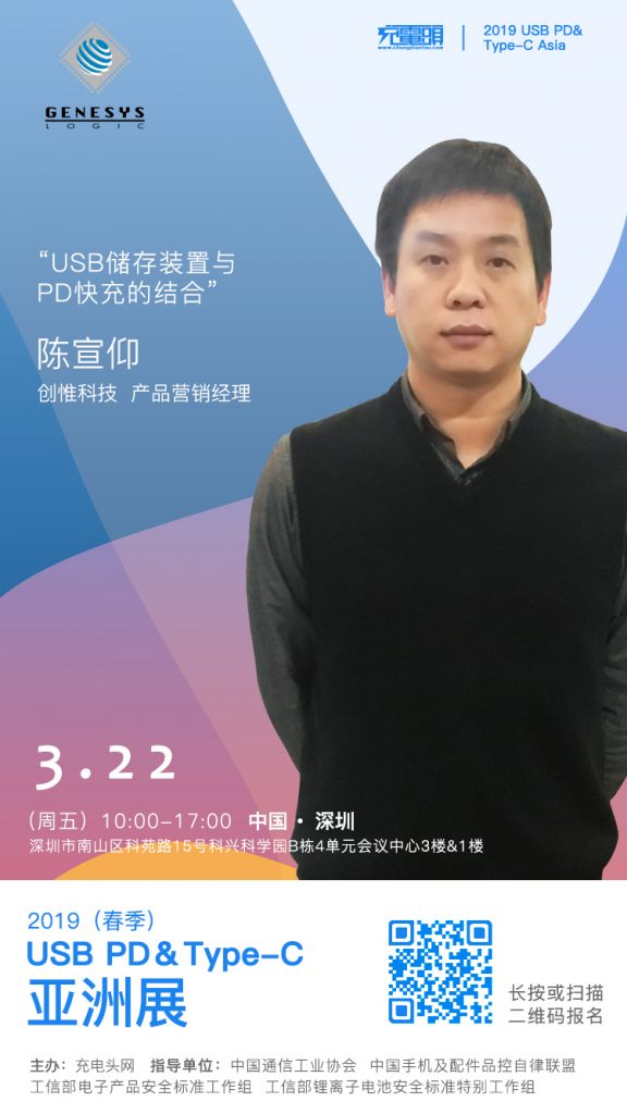 创惟科技产品营销经理 陈宣仰,本次峰会的演讲主题是《USB储存装置与PD快充的结合》。陈宣仰先生,自2011年起担任台湾创惟科技股份有限公司的产品营销经理,负责市场调查、产品规划与营销以及客户支持,拥有USB、PCIE与高速储存接口等相关领域11年的从业经验。