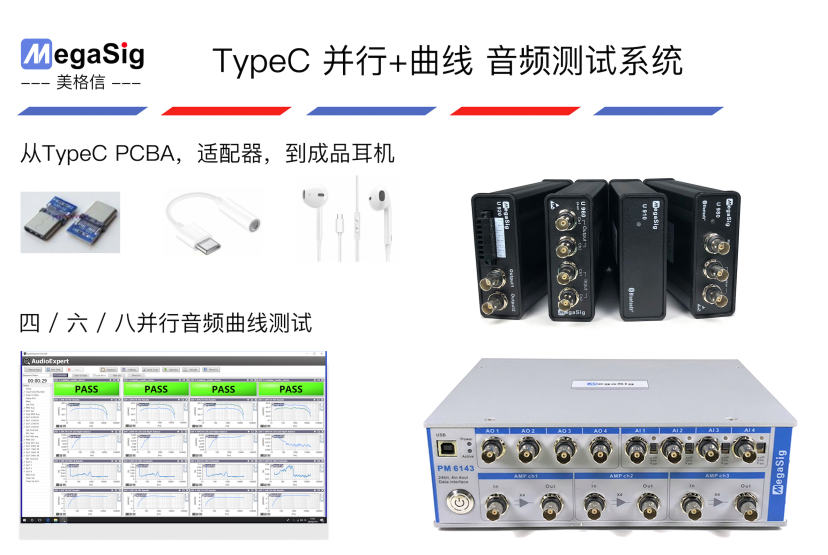 美格信的一拖四TypeC音频曲线并行测试系统,稳定并批量地服务着手机的随机配赠耳机的量产音频测试,客户群覆盖国际几个知名手机品牌商,有着如下几个品牌的TypeC codec 音频芯片的调试经验,BES,Synaptics,Cirrus Logic等。