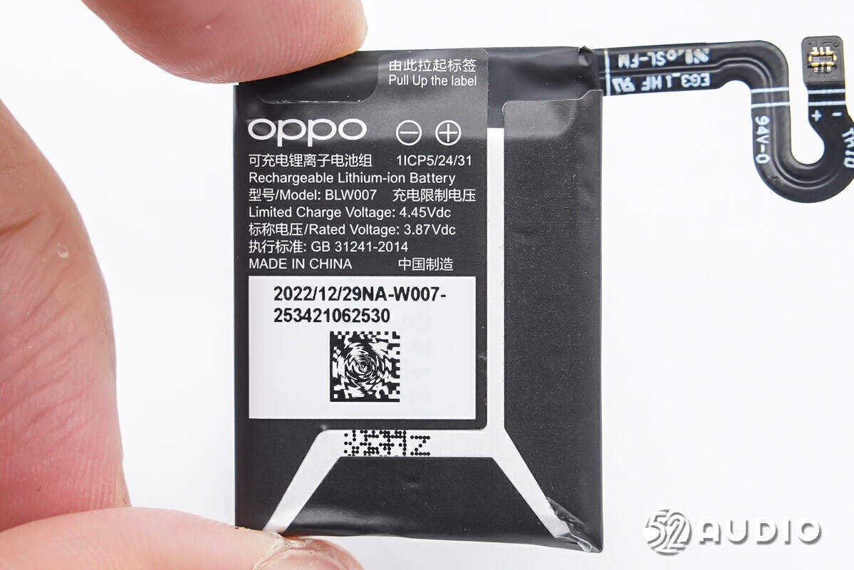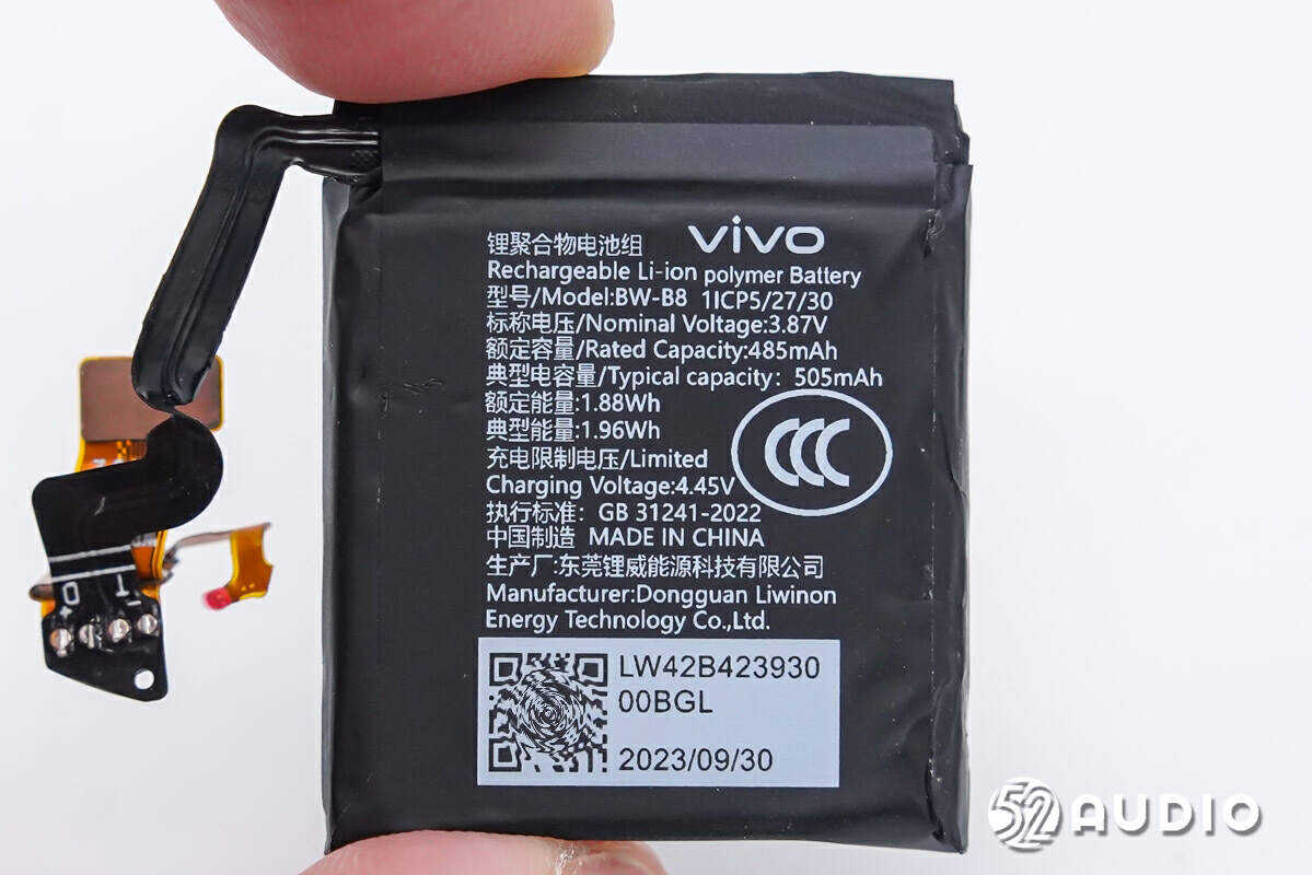 手表内置聚合物锂电池组,型号:BW-B8,标称电压:3.87V,额定容量:485mAh,典型容量:505mAh,额定能量:1.88Wh,电芯能量:1.96Wh,充电限制电压:4.45V,生产厂:东莞锂威能源科技有限公司。