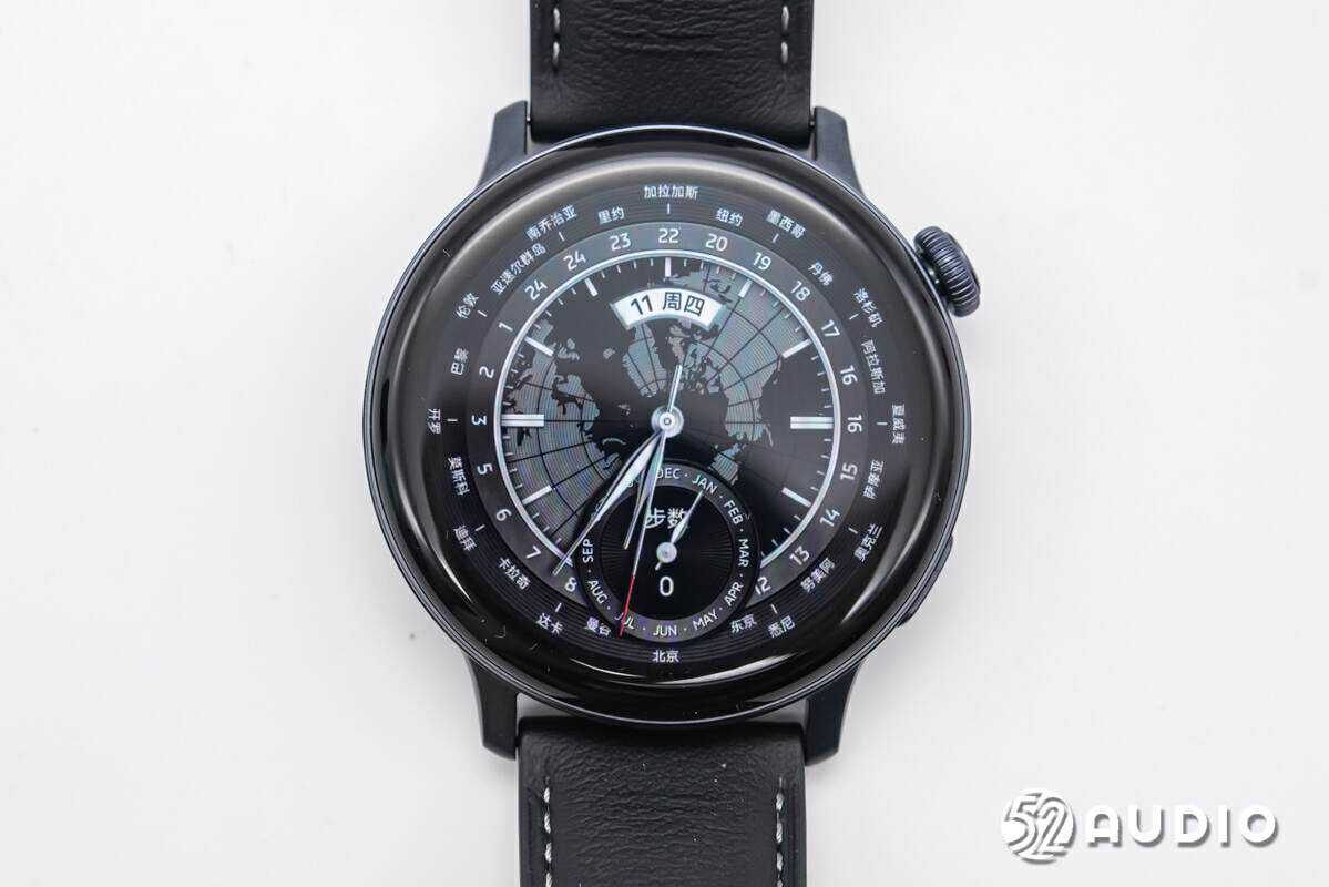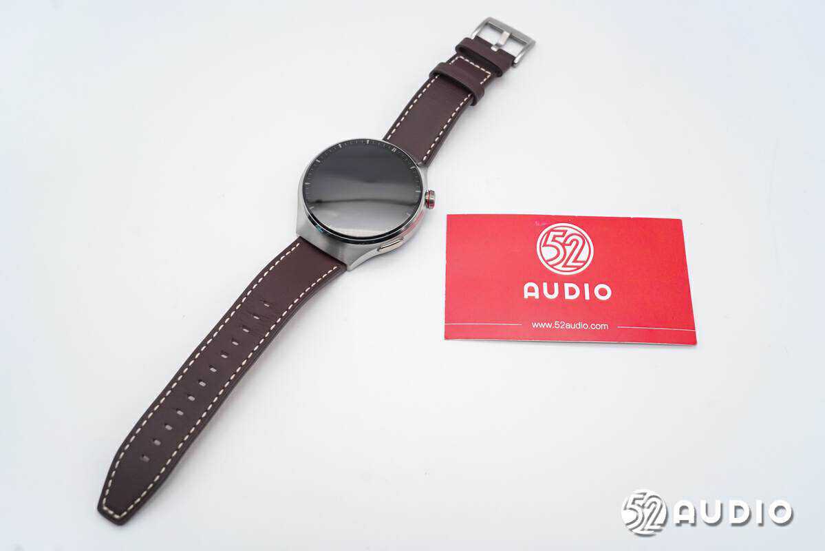 HUAWEI华为Watch 4 Pro智能手表正面外观一览,延续了系列圆形表盘设计,搭配深棕色真皮表带。表盘正面采用了1.5英寸OLED屏幕,球面蓝宝石玻璃面板为类似“穹顶”的微曲面设计,边缘有银色刻度和倒角,与亮面表圈自然过渡,观感十分大气。中框采用了航空级钛合金材质,结构层次递进,中间金属拉丝,上下两端打磨亮面倒角,实现更好的过渡。背部盖板上设置有气压计和麦克风开孔。表盘右侧设置有数字表冠和一颗功能按键,盖板上有扬声器的出音孔。