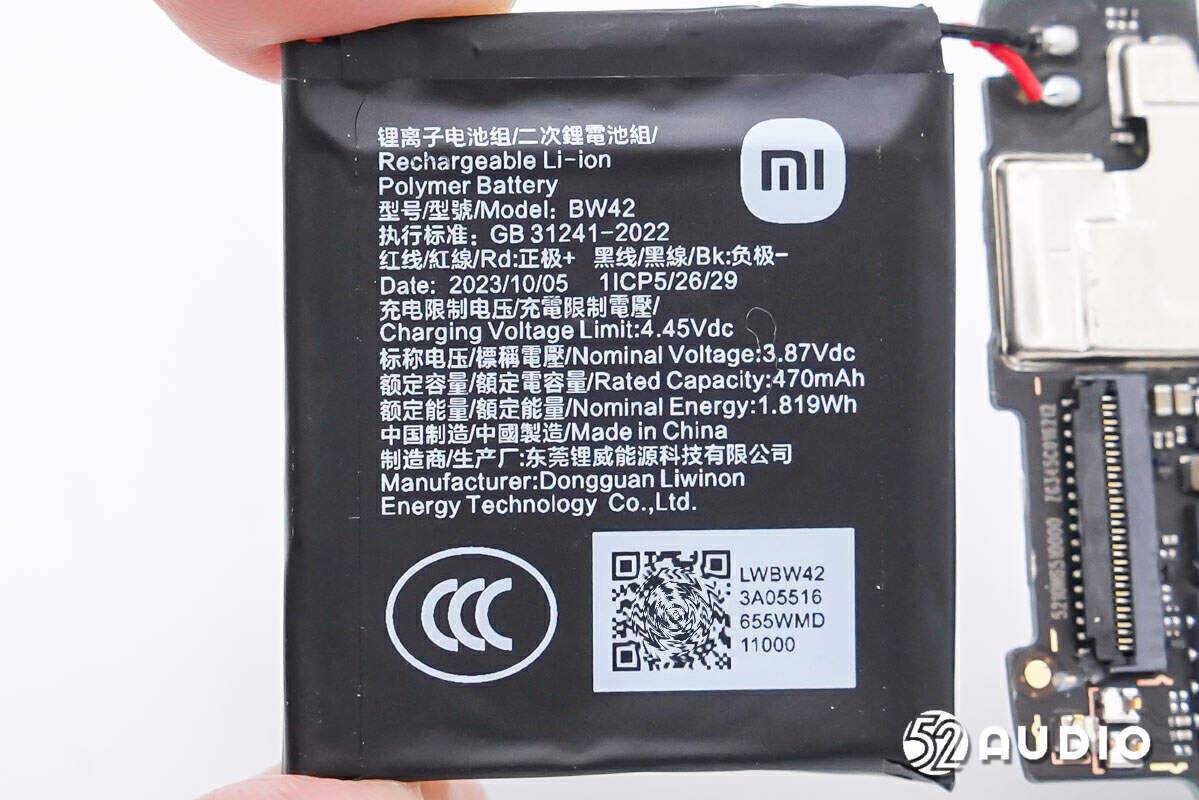 手表内置锂离子电池组,型号:BW42,充电限制电压:4.45V,标称电压:3.87V,额定容量:470mAh 1.819Wh,来自东莞锂威能源科技有限公司,中国制造。