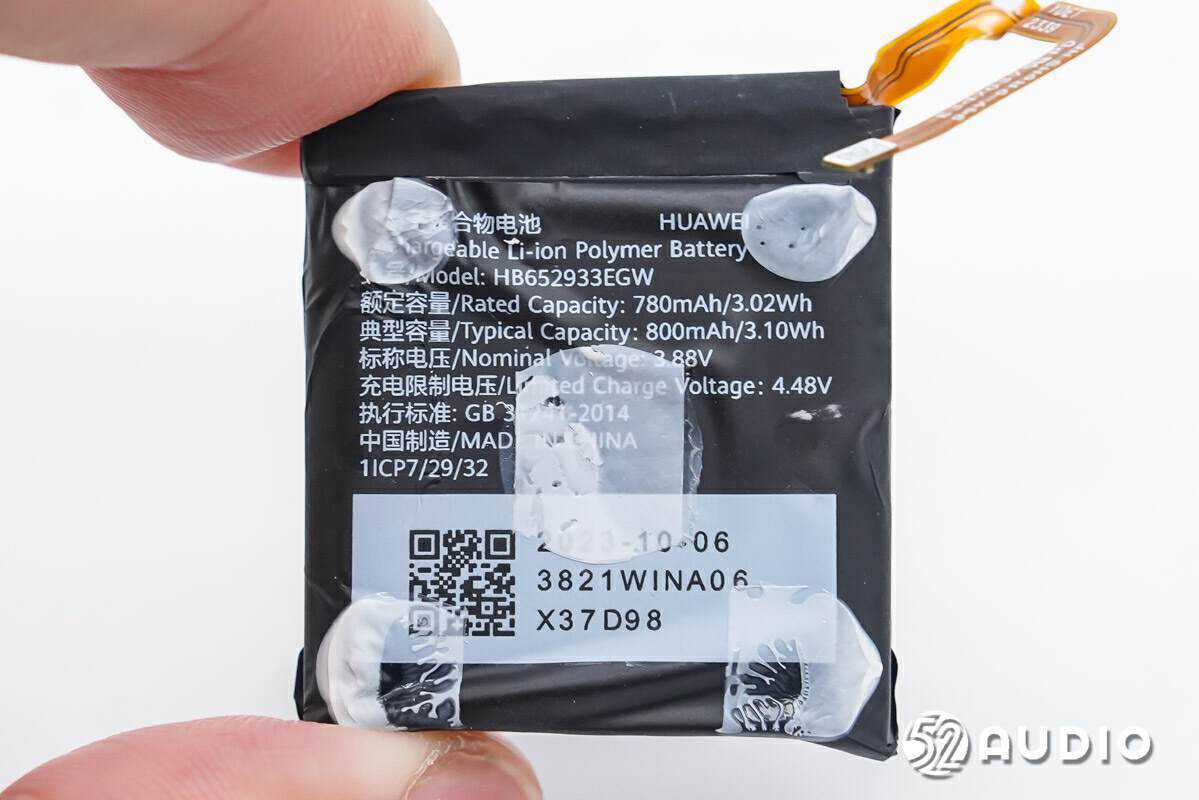 手表内置锂离子聚合物电池,型号:HB652933EGW,额定容量:780mAh 3.02Wh,典型容量:800mAh 3.10Wh,标称电压:3.88V,充电限制电压:4.48V,中国制造。